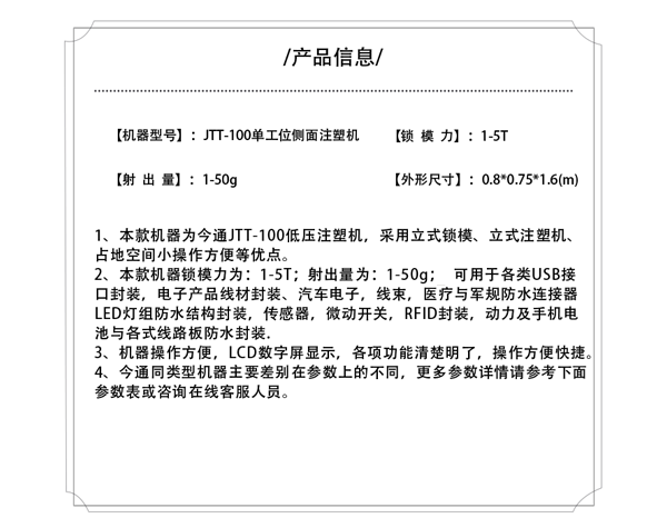 上一篇:抱歉暫無數(shù)據(jù) 下一篇:JTT-100-1-Z無膠管增壓缸低壓注塑機(側(cè)面注膠)